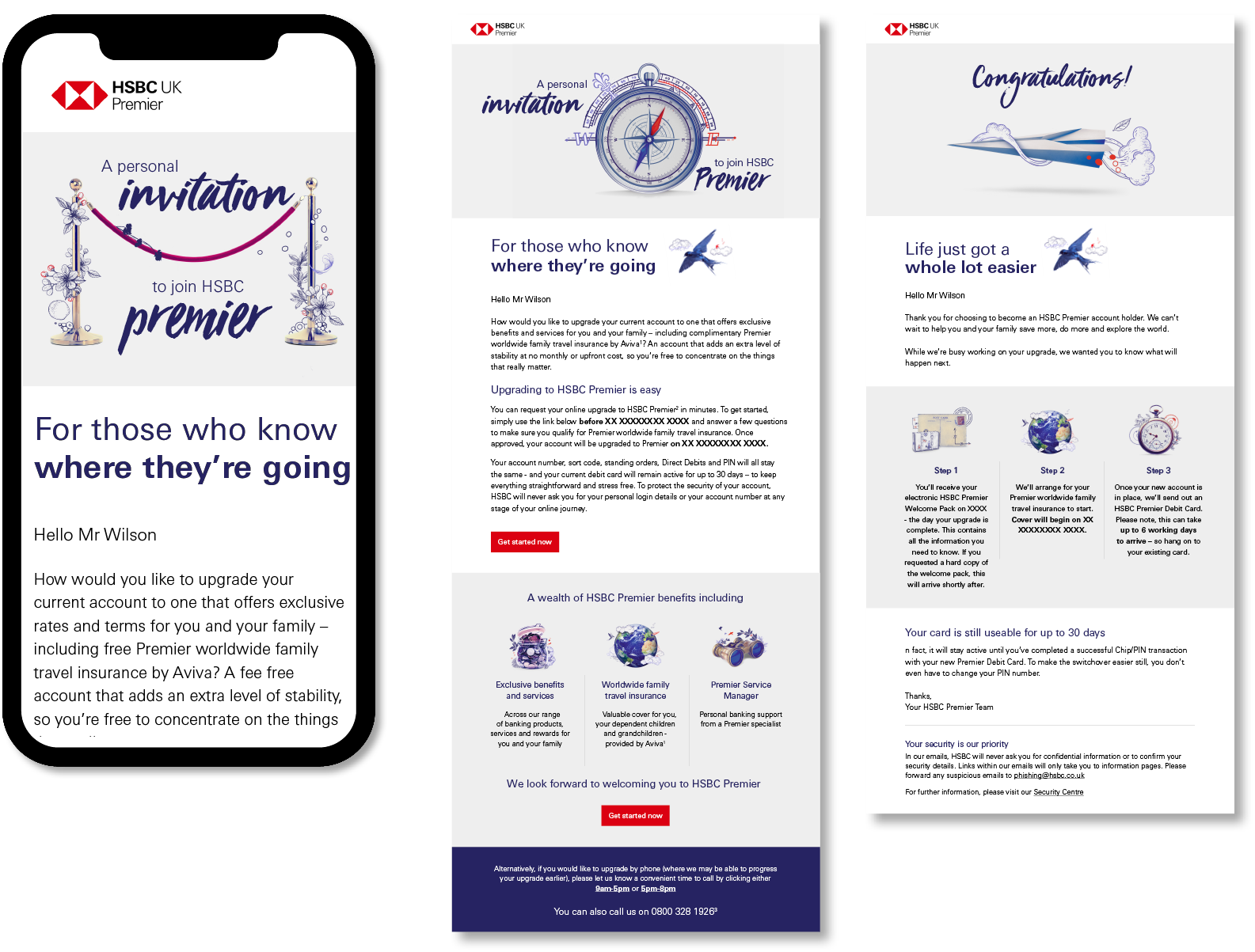 Created HSBC Premier assets in multiple styles, but unified by the ratio rules of the brand colour palette. Illustrations are used only for subtle embellishment that enhance, rather than detract from the hero object/protagonist.